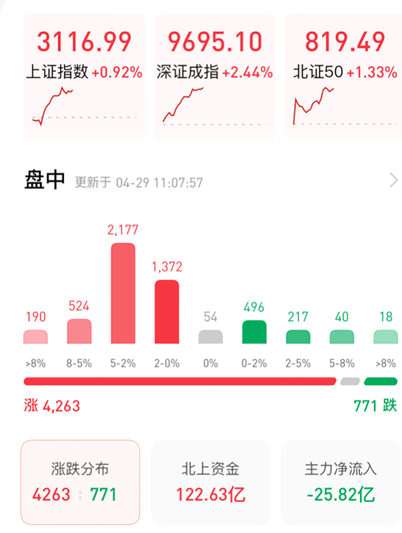 早盘,A股市场大幅走强。新能源、房地产、大金融等权重板块集体拉升,带动三大股指全线飘红,沪指站上3100点并重返年线上方,创业板指半日涨近4%。沪深两市半天成交近8000亿元,放量明显。北向资金继续扫货,半日净买入127.16亿元。