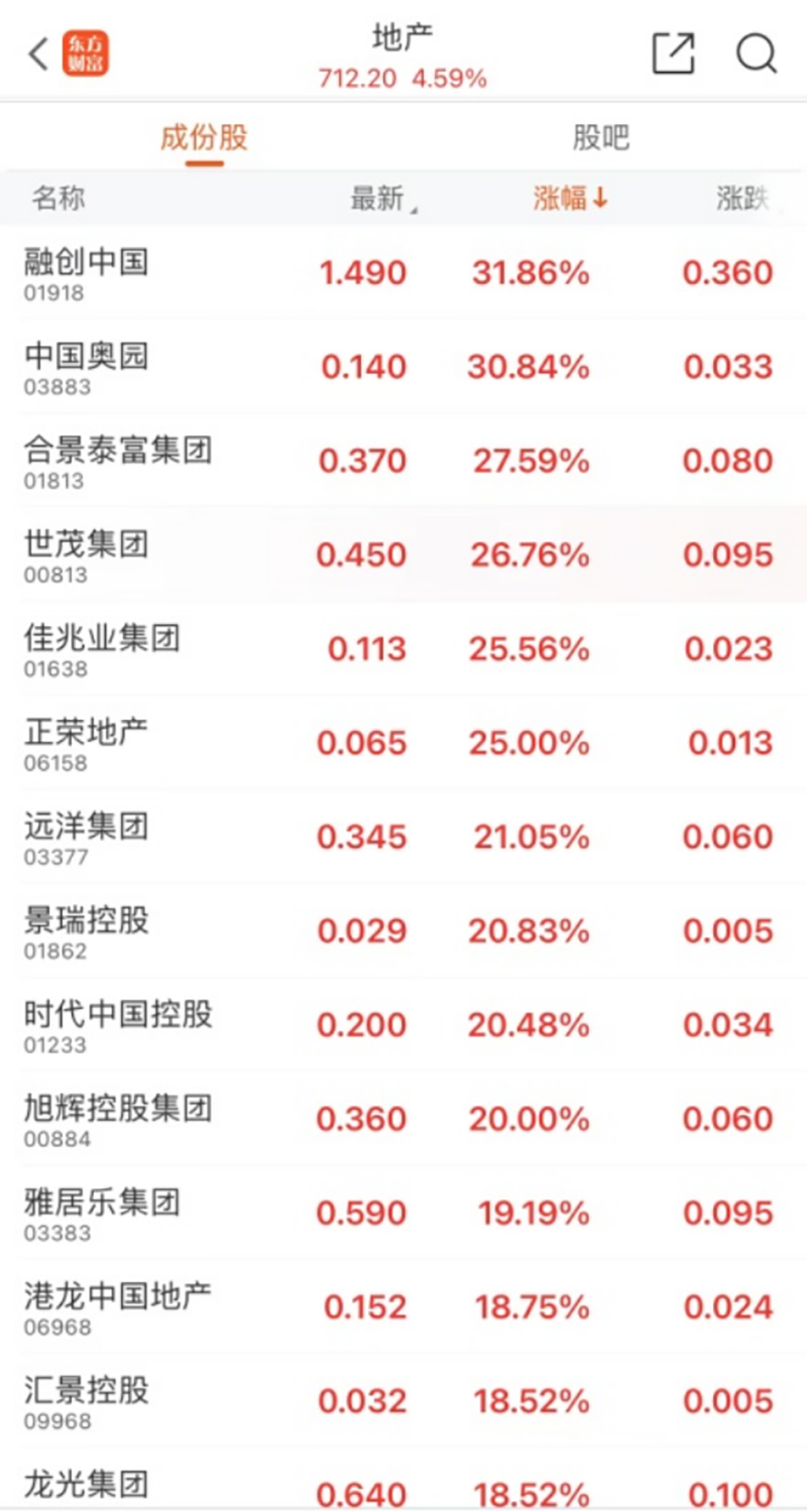 消息一出,A股、港股房地产板块应声大涨。港股市场中,融创中国、中国奥园涨超30%,合景泰富集团涨超27%,世茂集团涨超26%,佳兆业集团、正荣地产涨超25%,远洋集团涨超21%。