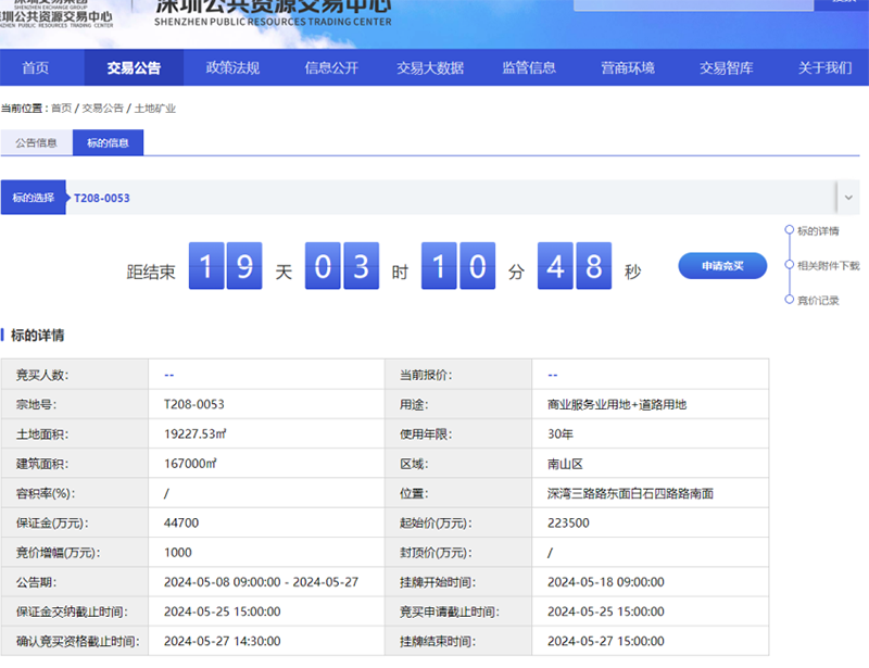5月8日,根据深圳公共资源交易中心公示,位于深圳湾超级总部基地的T208-0053宗地使用权挂牌转让,起始价为22.35亿元。据悉,万科于2017年12月在该宗地块首次出让时摘得,土地面积19227.53平方米,用地性质主要为商业办公等。