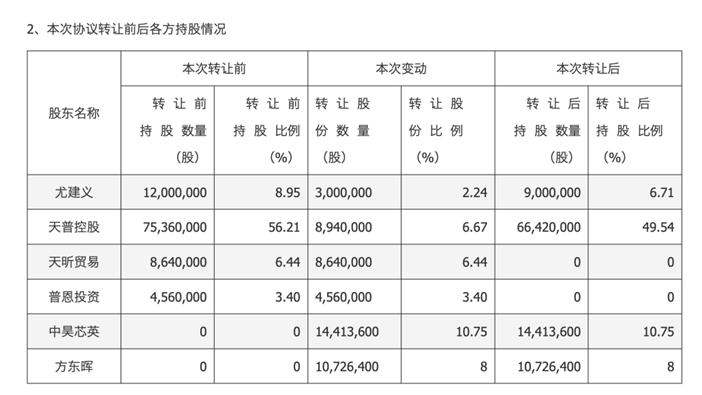 首先,公司实控人尤建义及其控制下的天普控股、天昕贸易公司合计将天普股份10.75%的股份转让给中昊芯英。同时,普恩投资、天昕贸易拟以协议转让的方式向自然人方东晖转让合计8%的股份。