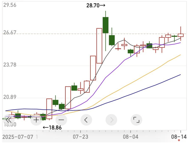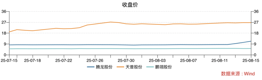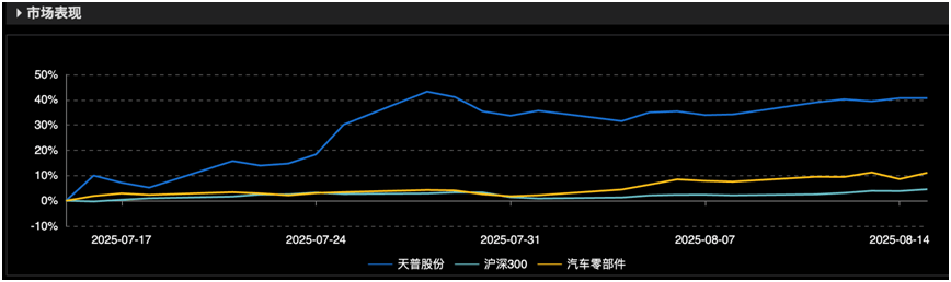 近一个月来,公司股价经历了三次涨停。在7月24日、25日、28日连续三个交易日内,天普股份收盘价格涨幅偏离值累计超过20%。公司股价在7月29日创出28.7元/股的新高。之后股价有所波动,截至8月14日收盘,股价报26.64元/股。