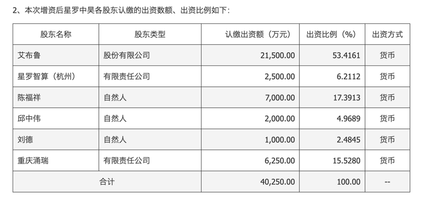 8月15日晚间,上市公司艾布鲁披露,公司拟使用自有资金9000万元对控股子公司杭州星罗中昊科技有限公司(简称“星罗中昊”)增资,完成后,艾布鲁直接持有星罗中昊53.42%股权,叠加其全资子公司星罗智算科技(杭州)有限公司持有的6.21%股权,艾布鲁合计持有星罗中昊59.63%的股权。