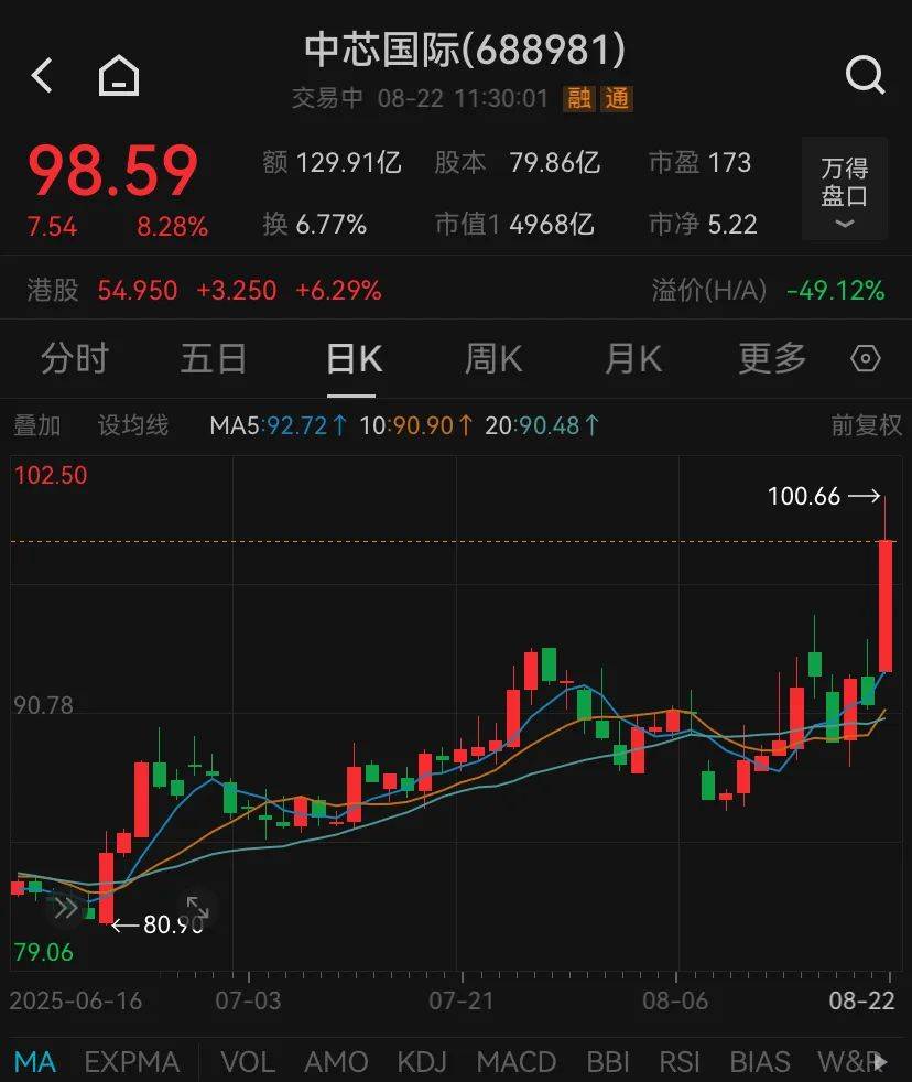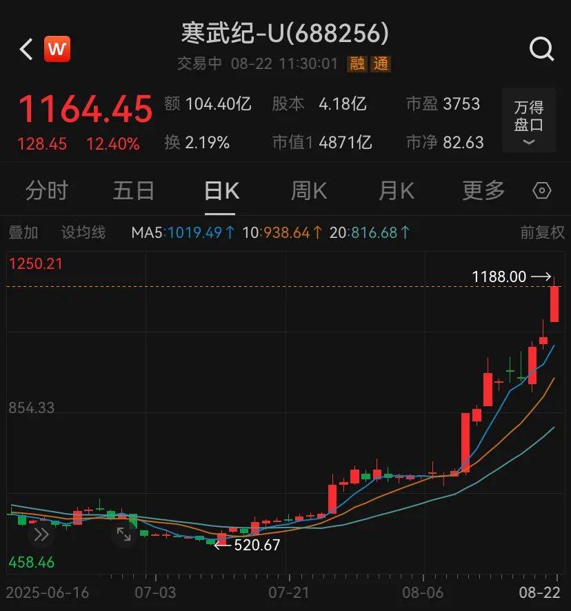 8月22日早盘,AI芯片龙头寒武纪-U持续拉升,大涨12.4%,股价突破1100元关口,报1164.45元,续创历史新高。盘中,寒武纪-U一度大涨近14%,股价盘中最高涨至1188元/股,总市值超4940亿元,超过中芯国际,短暂跃居科创板头名。截至午间收盘,中芯国际总市值报4968亿元,寒武纪-U报4871亿元。