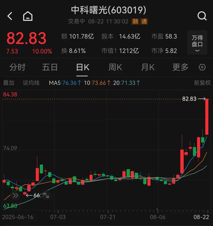 信创龙头中科曙光早盘封住涨停,报82.83元/股,半日成交额超100亿元。