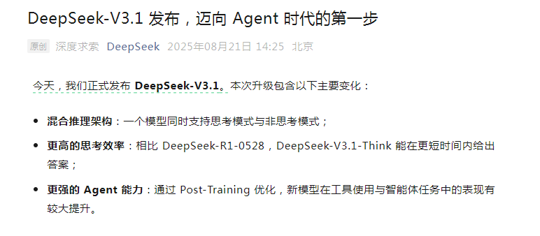 消息面上,DeepSeek8月21日宣布,正式发布DeepSeek-V3.1。据介绍,这款大模型为混合推理架构,同时支持思考模式与非思考模式。思考效率更高,相比DeepSeek-R1-0528能在更短时间给出答案。此外,新模型在工具使用与智能体任务中的表现有较大提升。新模型在智能体能力上实现突破。