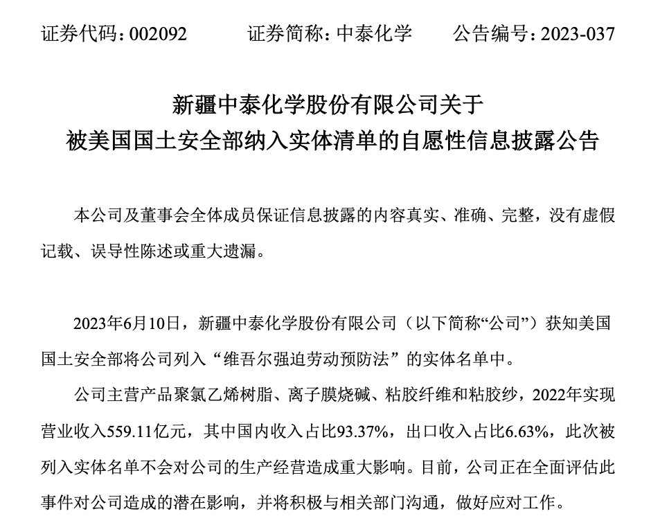 中泰化学在公告中表示,6月10日,公司获知美国国土安全部将公司列入实体名单中。此次被列入实体名单不会对公司的生产经营造成重大影响。