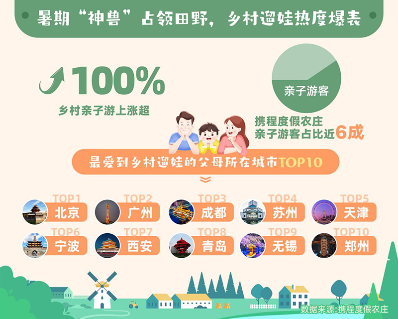 其中,2023年暑期最钟爱去乡村“溜娃”的父母分别来自北京、广州、成都、苏州、天津、宁波、西安、青岛、无锡、郑州。