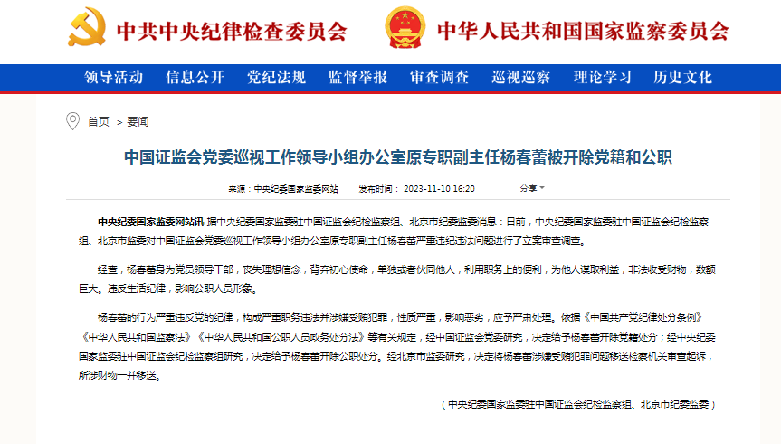 杨春蕾的行为严重违反党的纪律,构成严重职务违法并涉嫌受贿犯罪,性质严重,影响恶劣,应予严肃处理。依据《中国共产党纪律处分条例》《中华人民共和国监察法》《中华人民共和国公职人员政务处分法》等有关规定,经中国证监会党委研究,决定给予杨春蕾开除党籍处分;经中央纪委国家监委驻中国证监会纪检监察组研究,决定给予杨春蕾开除公职处分。经北京市监委研究,决定将杨春蕾涉嫌受贿犯罪问题移送检察机关审查起诉,所涉财物一并移送。