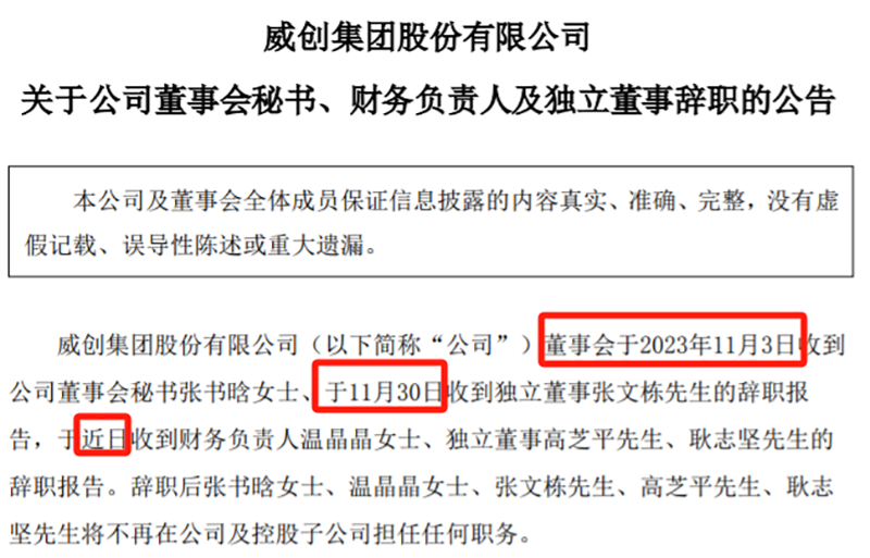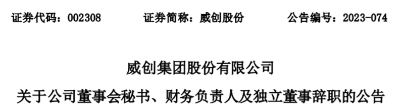 11月3日、11月30日,威创股份董事会相继收到董秘张书晗、独立董事张文栋的辞职报告。