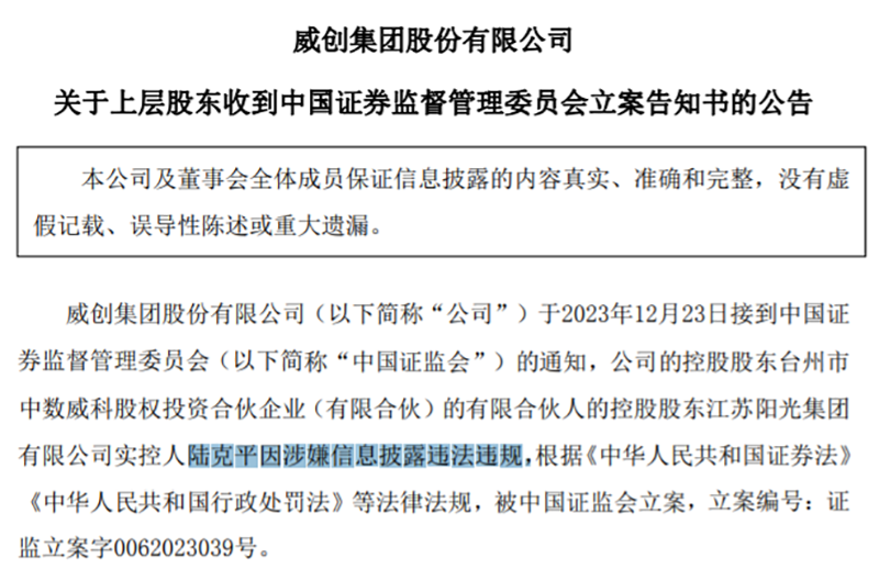 12月23日,威创股份又收到中国证监会通知,公司控股股东台州市中数威科股权投资合伙企业(有限合伙)(下称“中数威科”)的有限合伙人的控股股东江苏阳光集团有限公司实控人陆克平,涉嫌信息披露违法违规,中国证监会根据相关法律法规决定对其立案。
