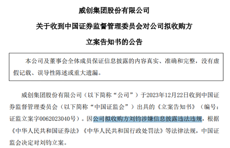 12月22日,威创股份收到中国证监会出具的《立案告知书》。威创股份介绍,公司、公司拟收购方刘钧,涉嫌信息披露违法违规,中国证监会根据相关法律法规,决定对公司及刘钧立案。