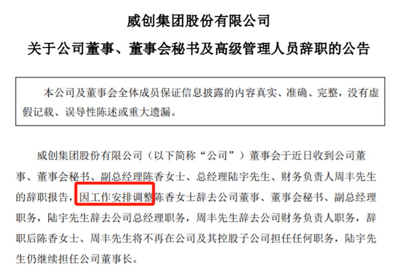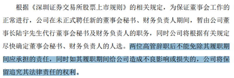 二是离职影响,威创股份仅在张书晗、温晶晶离职的公告中提及:“两位高管辞职后不能免除其履职期间应承担的责任,同时如其履职期间给公司造成不良影响或损失的,公司将保留追究其法律责任的权利。”