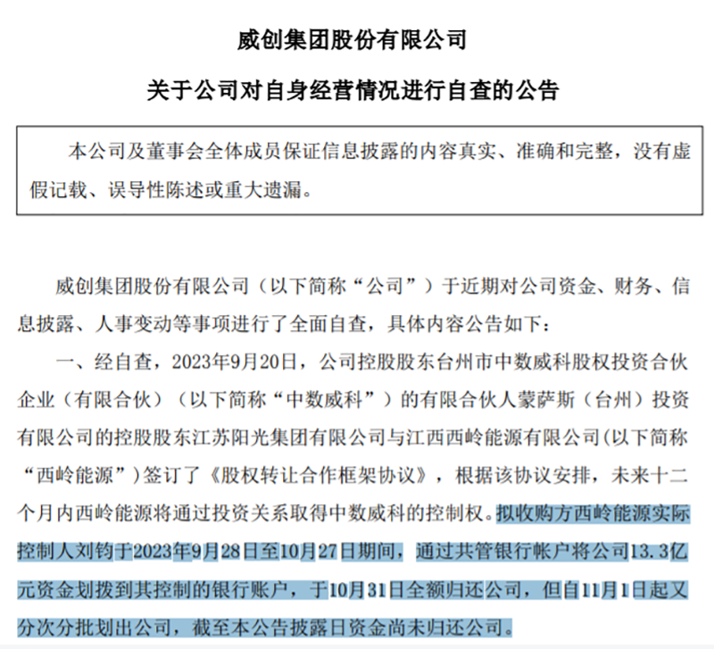 近期,威创股份及相关人员,涉嫌信息披露违法违规收到中国证监会《立案告知书》。同时,威创股份自查发现,拟收购方西岭能源实控人刘钧,多次划拨上市公司巨额资金至其掌控的银行账户,截至目前尚未归还上市公司。