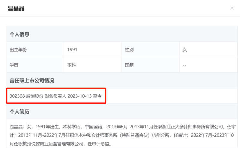 公开资料显示,张书晗、温晶晶均是从10月13日开始,分别任职威创股份董秘、财务负责人。截至11月3日辞职,张书晗任职时间不足一个月;温晶晶任职时间不足三个月。