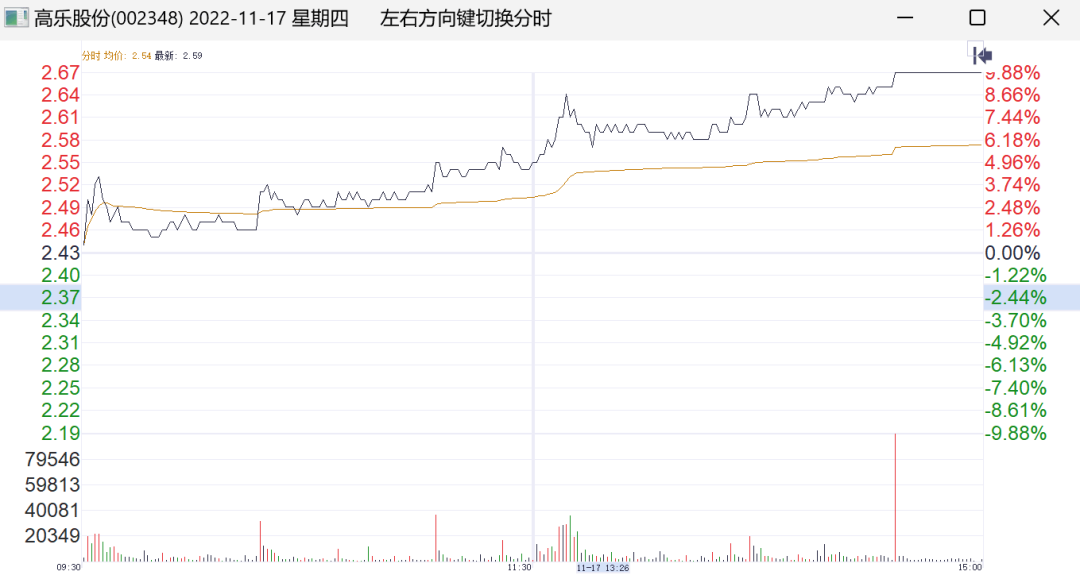 耐人寻味的是,2022年11月17日午后,高乐股份股价震荡走高,在临近收市的最后半小时封上涨停板,收于2.67元/股。