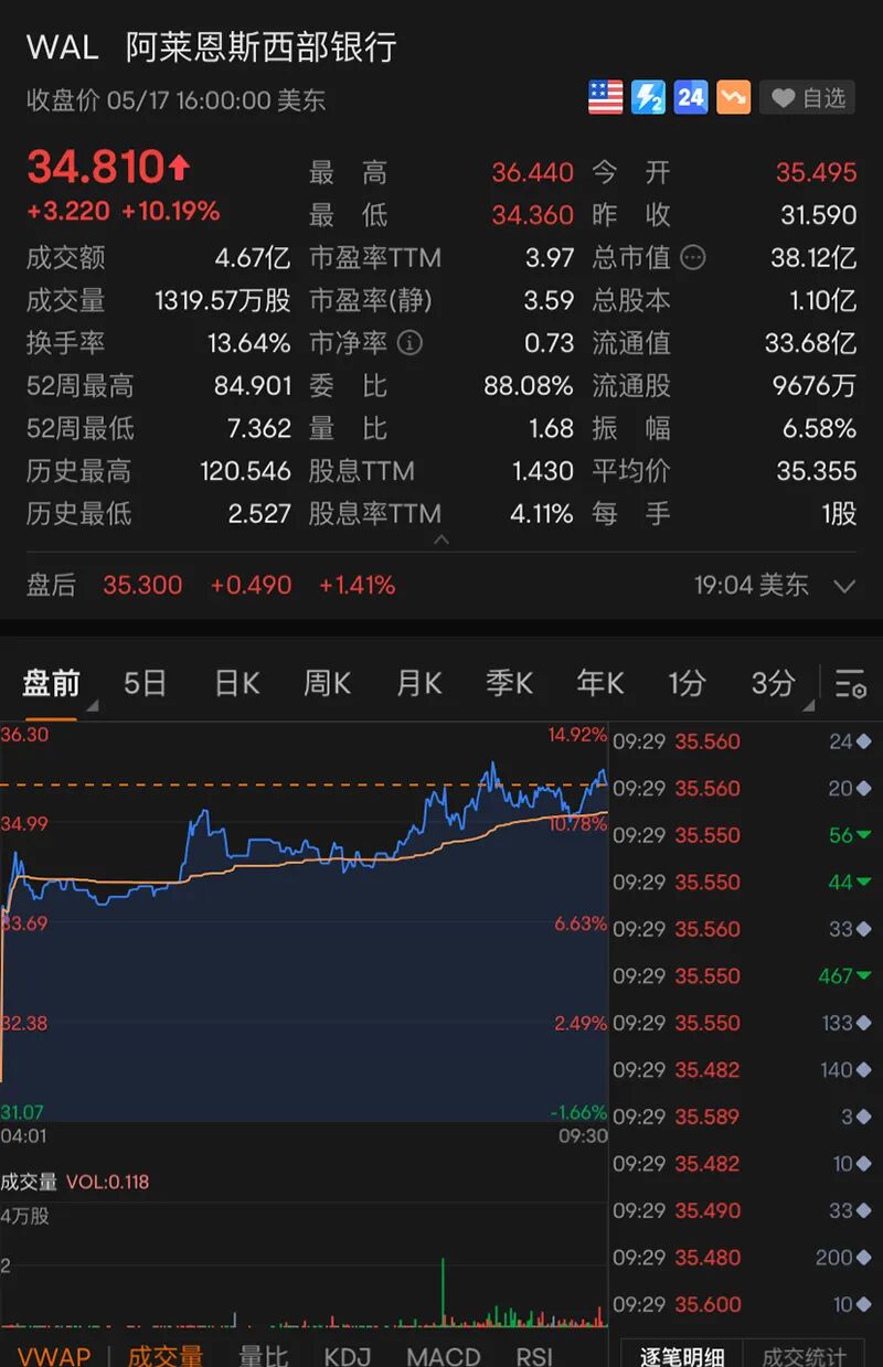 地区银行中,西太平洋合众银行(PacWest Bancorp)涨超21%;阿莱恩斯西部银行(Western Alliance Bancorp)涨超10%;Zions Bancorporation涨12%。