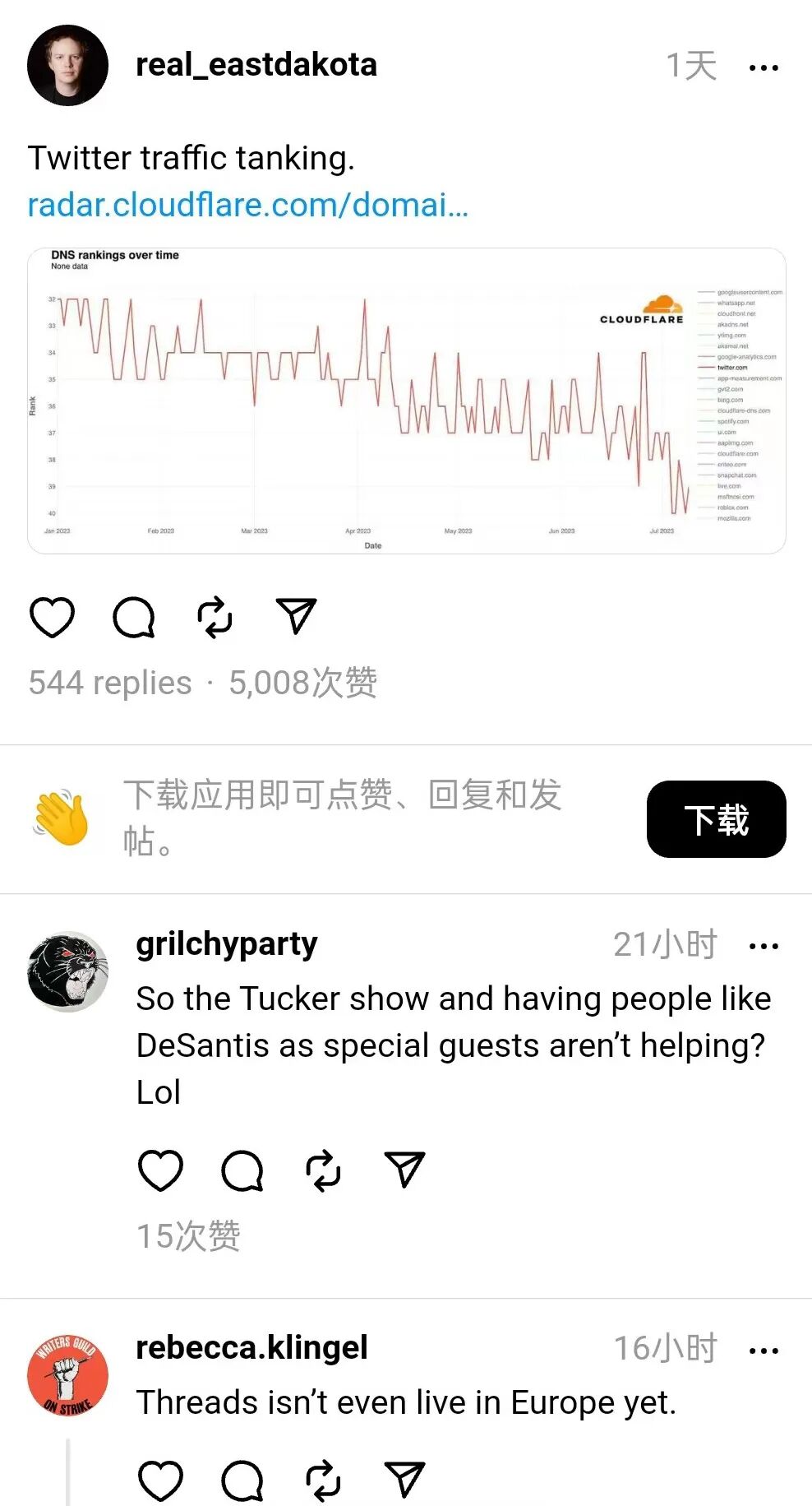 就在推特的竞品被不断推上热搜之际,7月9日,云服务提供商Cloudflare首席执行官Matthew Prince分享了一张推特受欢迎程度的图表,1月推特位列榜单第32位;5月至6月,该软件排名在第35名和第37名之间波动;而到了7月初,其受欢迎程度迅速下滑,跌至第40位。“推特的流量暴跌。”他评价道。