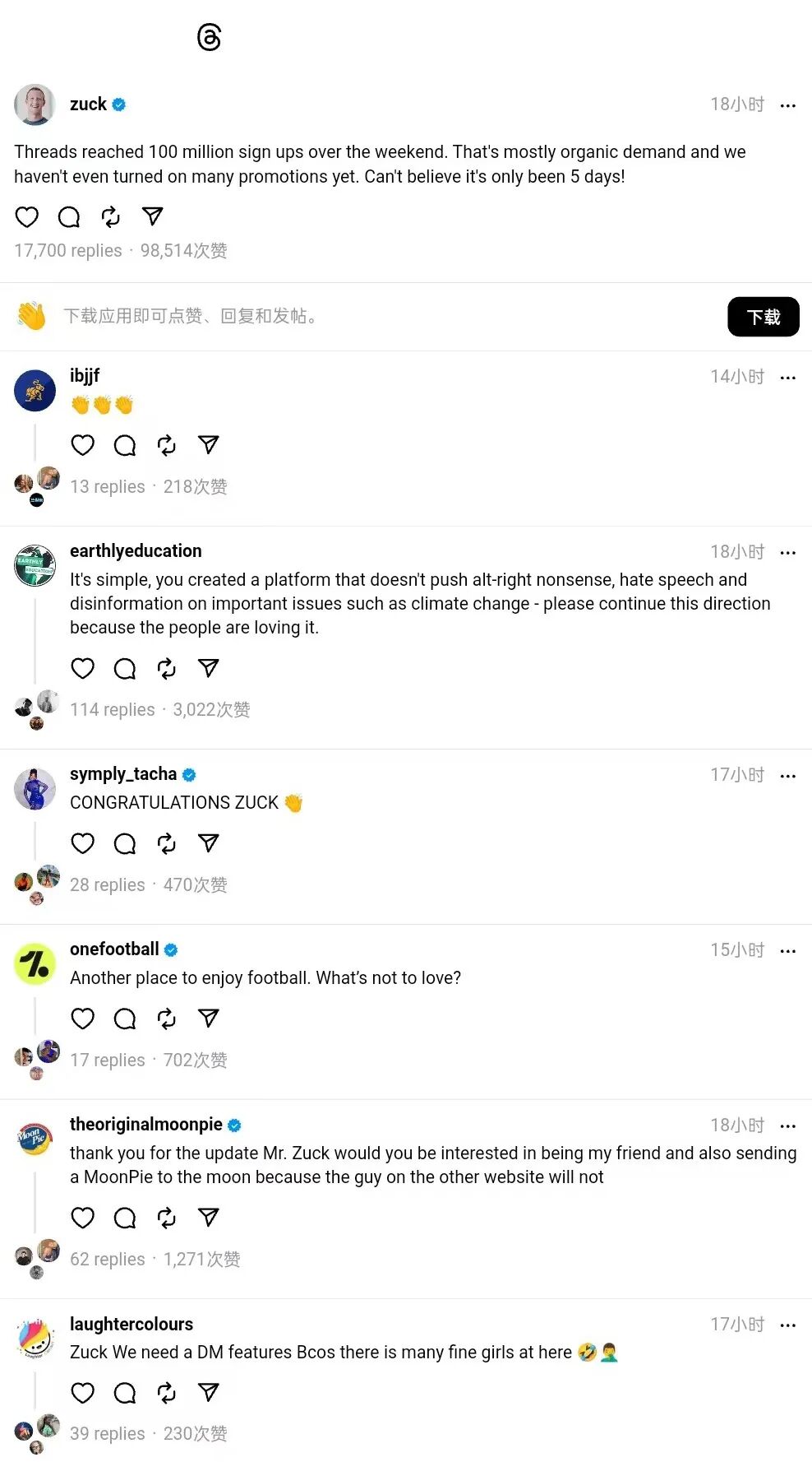 美东时间上周三,Meta宣布,从当天起用户可以在100多个国家的苹果App Store和谷歌Google Play免费下载Threads。5天中,扎克伯格多次对外宣布用户增长进展,4个小时500万用户注册;7小时1000万;16小时超3000万;不到两天超7000万......