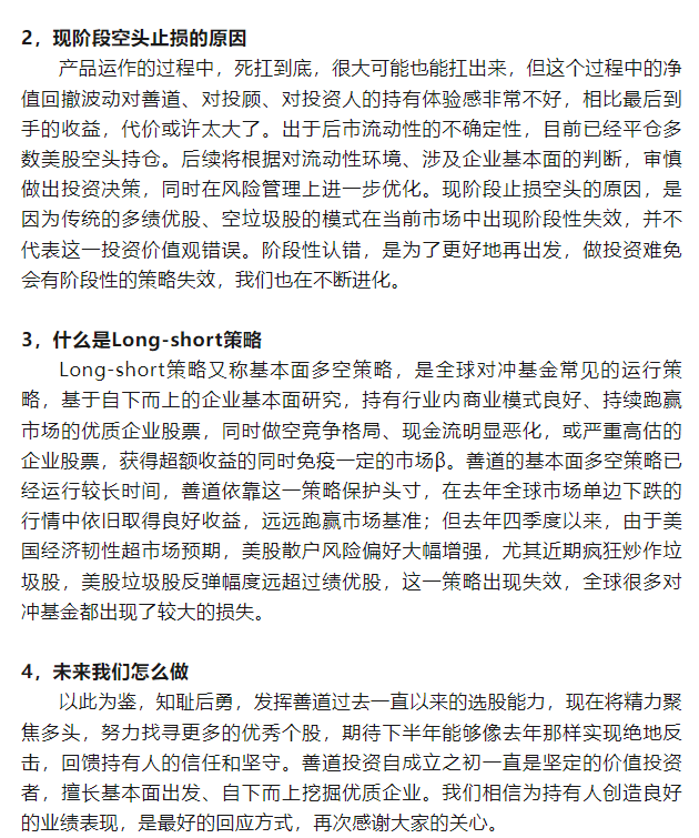 今天下午三点,善道投资还发布公告称,现阶段止损空头的原因,是因为传统的多绩优股、空垃圾股的模式在当前市场中出现阶段性失效,并不代表这一投资价值观错误。后续将根据对流动性环境、涉及企业基本面的判断,审慎做出投资决策,同时在风险管理上进一步优。