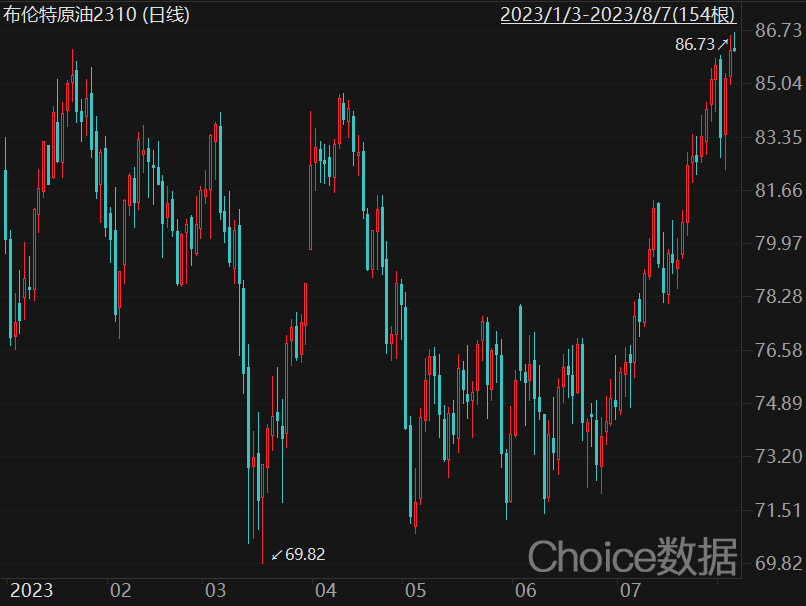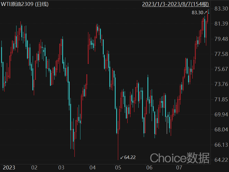 受风险事件刺激,国际油价近期持续飙升。北京时间今日上午,WTI原油2309合约最高升至83.30美元/桶,创今年以来新高,自6月底以来累计涨幅超过20%;布伦特原油2310合约最高升至86.73美元/桶,也创出今年以来新高,6月底以来涨幅约18%。