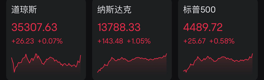 当地时间周一,美股三大指数集体收涨。截至收盘,道指涨0.07%,报35307.63点;标普500指数0.58%,报4489.72点;纳指涨1.05%,报13788.33点。