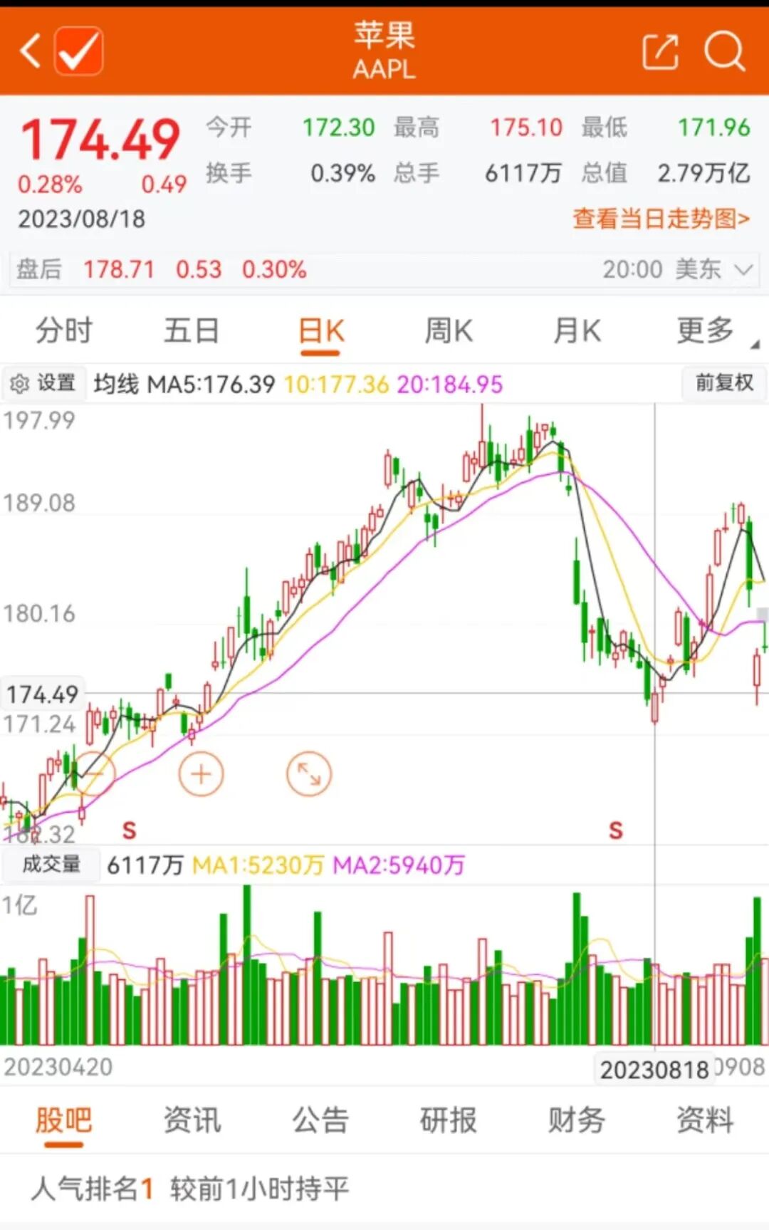 自8月18日以来,苹果公司股票短期上涨超9%。但是近一周以来,苹果公司表现不佳,累计下跌5.95%,市值蒸发约1764亿美元。