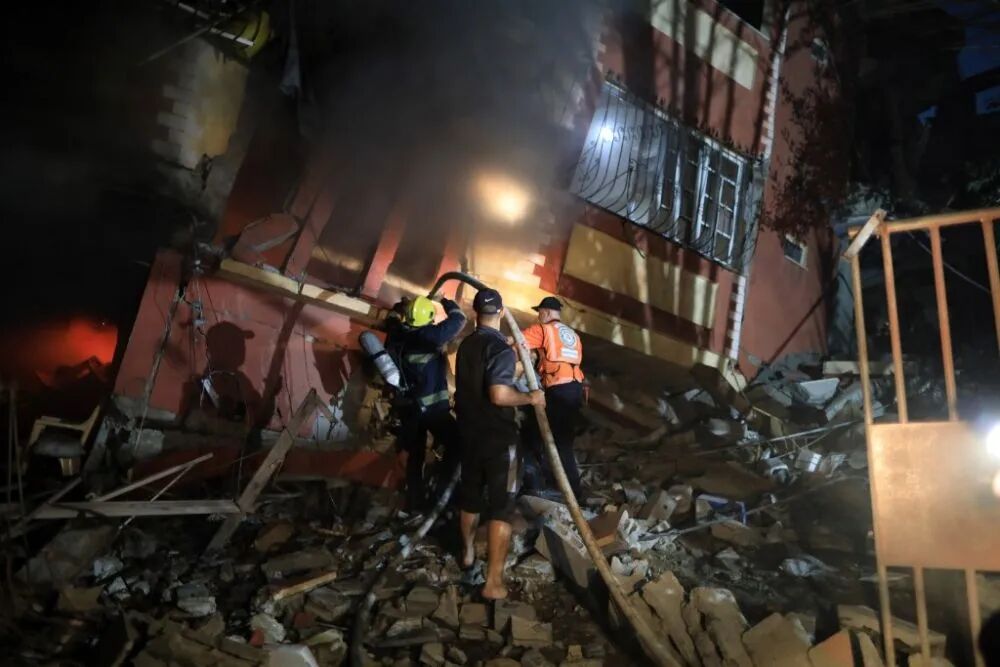 10月8日,巴勒斯坦民防人员在加沙地带南部城市汗尤尼斯一处被以色列空袭的民宅灭火。新华社发(亚西尔·库迪摄)