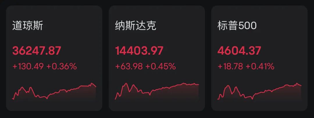 本周最后一个交易日,受美国11月非农数据强于市场预期影响,美股三大指数开盘小幅下跌。在市场消化情绪后,美股三大指数止跌回弹,最终小幅收涨。数据显示,截至收盘,道指涨130.49点,涨幅为0.36%,报36247.87点;标普500指数涨18.78点,涨幅为0.41%,报4604.37点;纳指涨63.98点,涨幅为0.45%,报14403.97点。