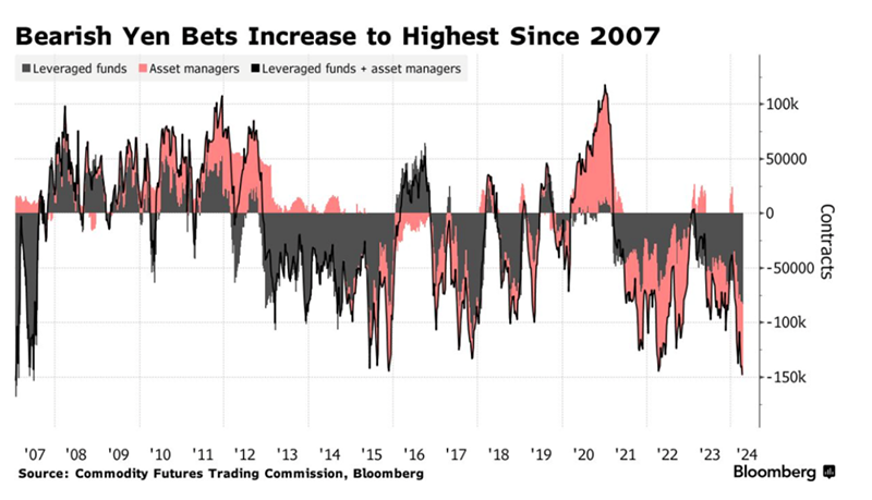 彭博社汇编的数据显示,根据美国商品期货交易委员会的最新数据,截至4月2日当周,全球对冲基金和资产管理公司持有的日元净空头合约增至148388份,为2007年1月以来的最高水平。