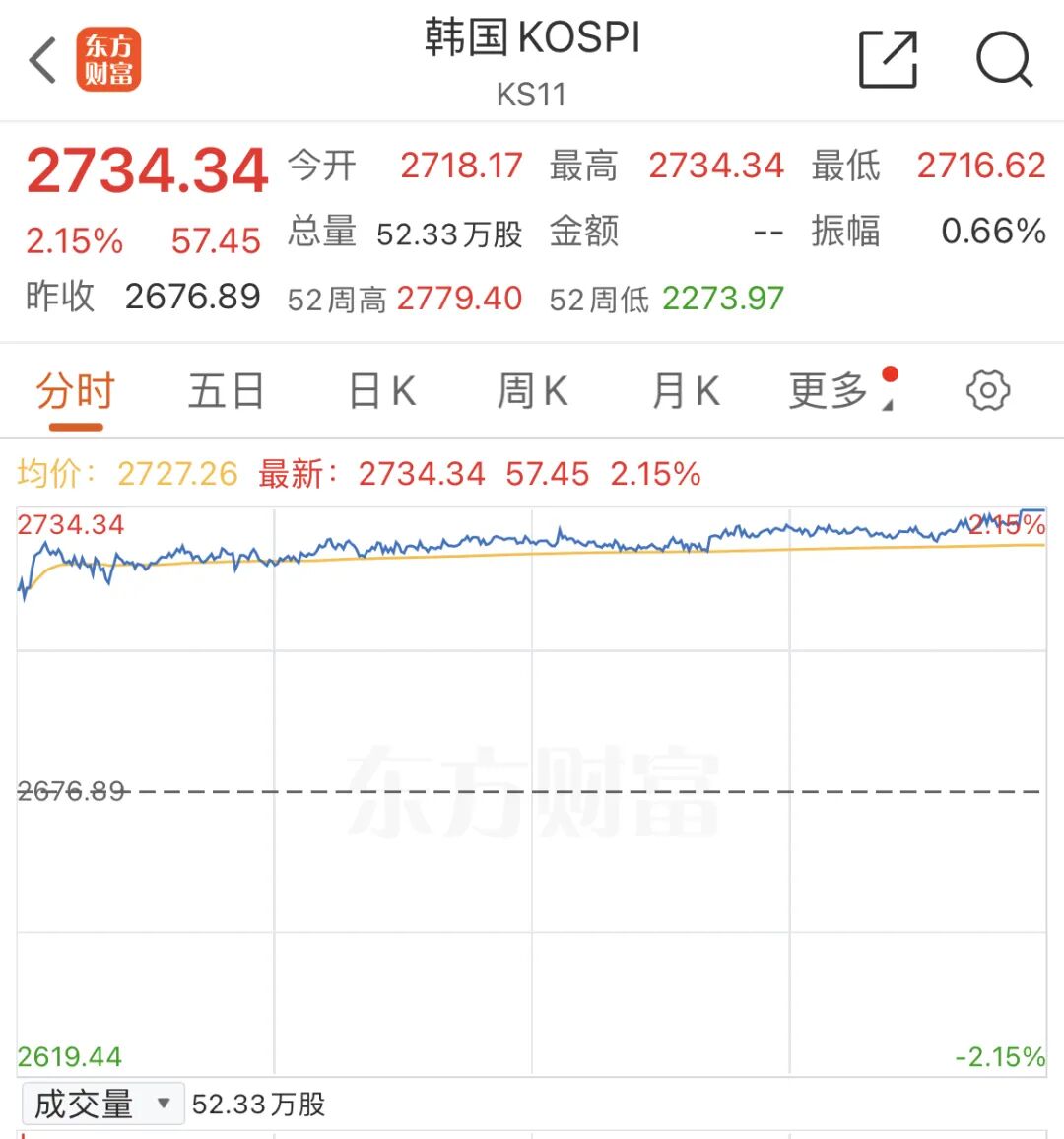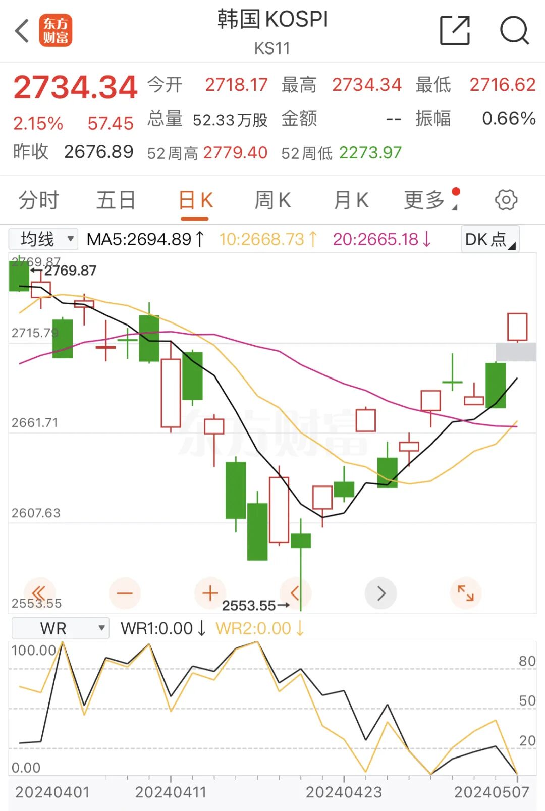 5月7日,韩国综合指数迎“跳空”大涨,全天强势高开高走,截至收盘,该指数收涨2.15%,报2734.34点。