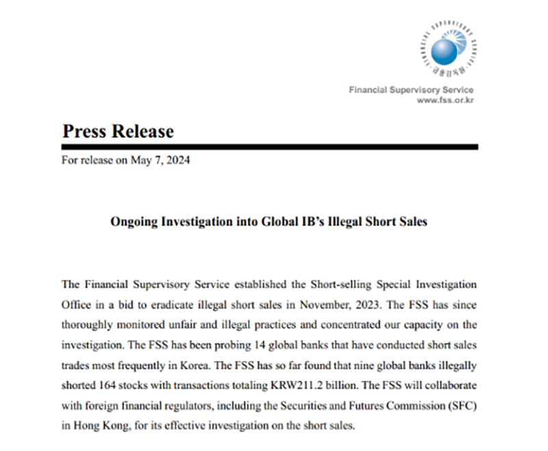 5月7日,FSS在官网发布针对全球性投行非法卖空行为的持续调查报告。