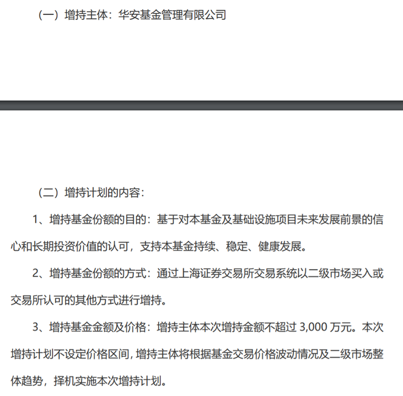 前一日,华安基金发布公告宣布,华安基金和该基础设施项目原始权益人及其控股关联方分别计划累计增持该基金不超过3000万元、2亿元,并承诺增持的基金份额持有期限不少于6个月。