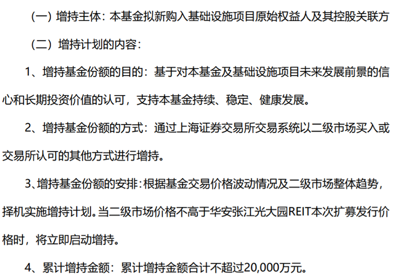 公告显示,基于对华安张江光大园REIT及基础设施项目未来发展前景的信心和长期投资价值的认可,为了支持该基金持续、稳定、健康发展,华安基金计划使用固有资金增持该基金金额不超过3000万元,并且该基金拟新购入基础设施项目原始权益人及其控股关联方计划累计增持该基金金额合计不超过2亿元。