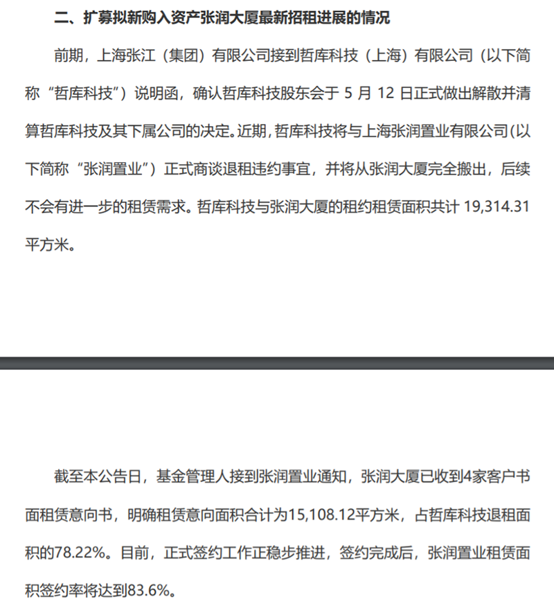 5月26日,华安张江光大园REIT发布公告宣布,将哲库科技1096万元租赁保证金归入基金财产,而基金原始权益人将承担此次退租损失。截至目前,张润大厦找到4个新租户,租赁意向面积达到1.51万平方米,占哲库科技退租面积的78.22%。