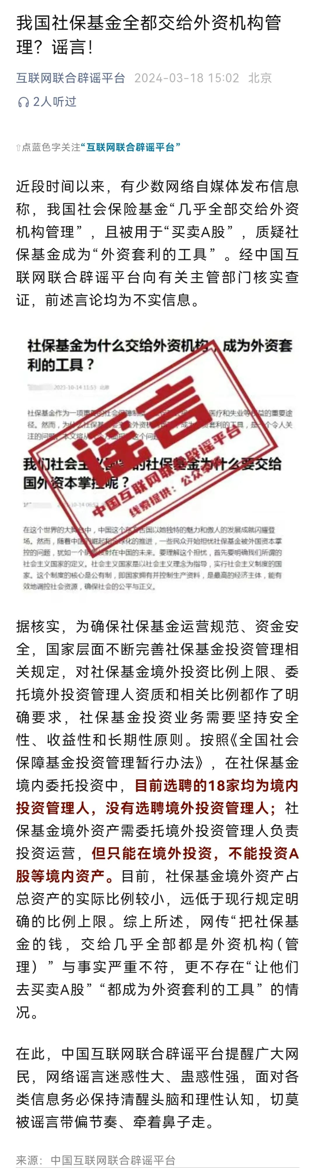 近段时间以来,有少数网络自媒体发布信息称,我国社会保险基金“几乎全部交给外资机构管理”,且被用于“买卖A股”,质疑社保基金成为“外资套利的工具”。经中国互联网联合辟谣平台向有关主管部门核实查证,前述言论均为不实信息。