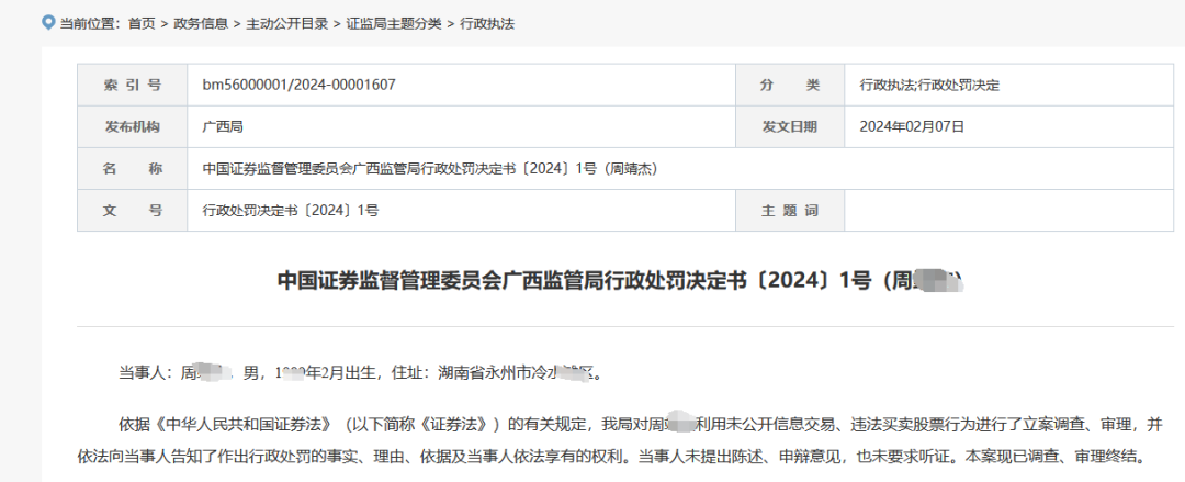 广西证监局披露的行政处罚决定书显示,2016年12月27日至2023年3月31日,周某杰担任了某头部证券公司营业部总经理。任职期间,周某杰拥有权限查看开立在该营业部的“聚鸣高山1号私募证券投资基金”等17个私募基金产品证券账户交易、持仓等未公开信息。