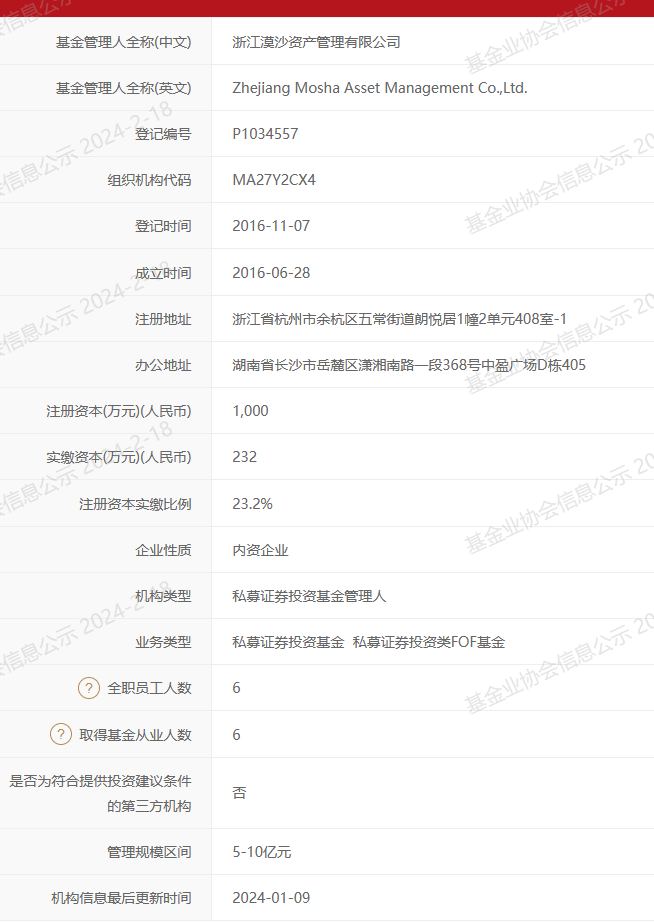 “抄袭方”——漠沙精选9号私募证券投资基金的管理人则为浙江漠沙资产管理有限公司(简称“漠沙资产”),是一家管理规模在5亿元到10亿元区间的私募证券投资基金管理人,该公司董事长为段兴宏,总经理为高源,公司全职员工人数仅为6人。