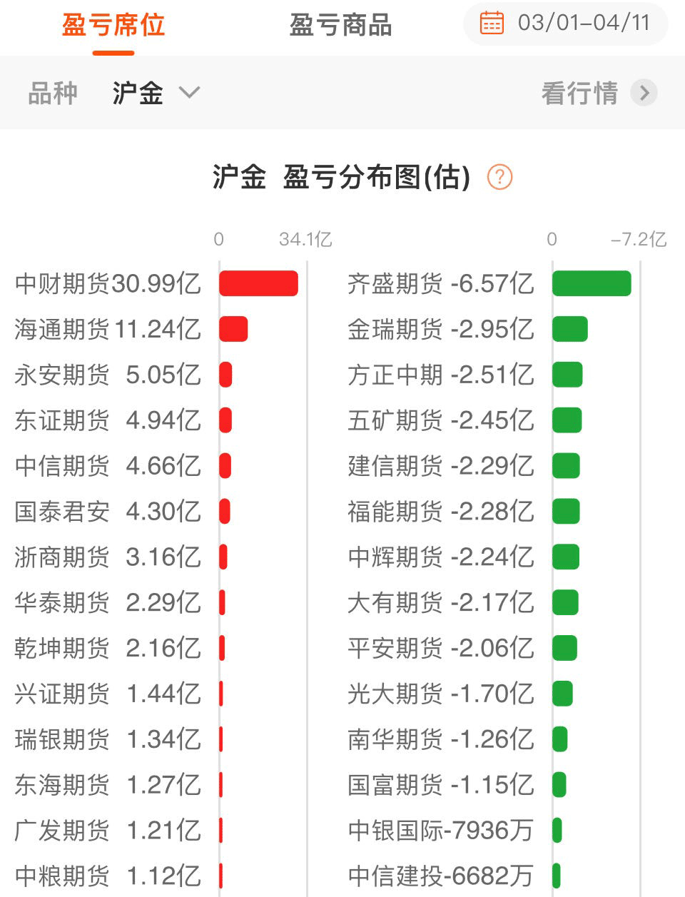中财期货背后客户的多头持仓,在近期的黄金单边行情中收益颇丰。经第三方机构测算,仅3月1日至4月11日,中财期货黄金头寸已在1个多月内盈利超过30亿元,且随着上涨行情持续,该席位盈利规模还在不断扩大。