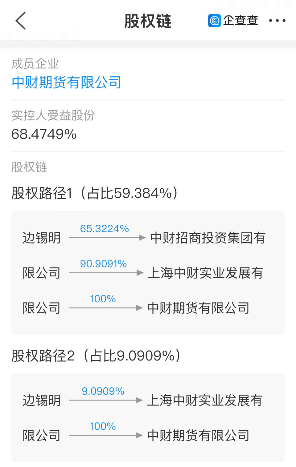 企查查显示,中财期货唯一股东是上海中财实业发展有限公司(持股比例100%),后者的大股东是中财招商投资集团有限公司(简称“中财集团”,持股比例90.91%),二股东是边锡明(持股比例9.09%)。