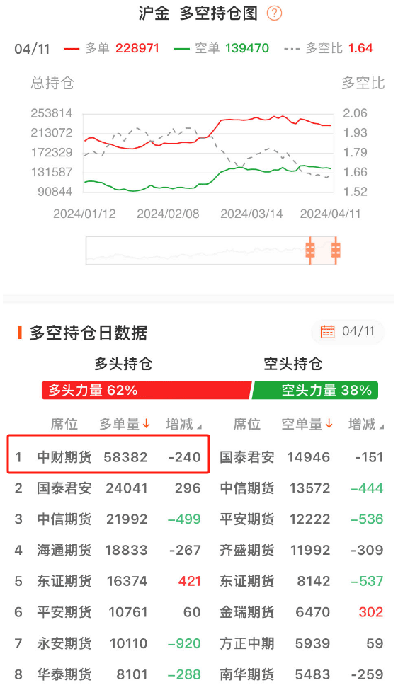 上期所数据显示,截至4月11日收盘,中财期货在AU2406、AU2408、AU2410、AU2412、AU2502合约中均为最大多头,总计持有黄金期货多单58382手(折合价值约325亿元),“碾压”排名第二的国泰君安期货(24041手)。