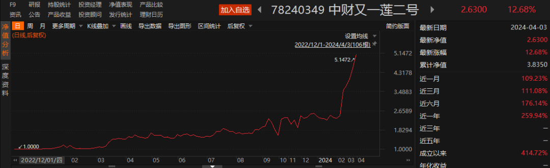 近期,一款名为“中财又一莲二号”的资管产品在各大论坛引发热议。记者发现,该资管产品的净值表现十分亮眼,今年以来净值涨幅高达100.3%,完成翻倍。自2022年12月1日成立以来,该产品复权后的净值涨幅达到414.72%。