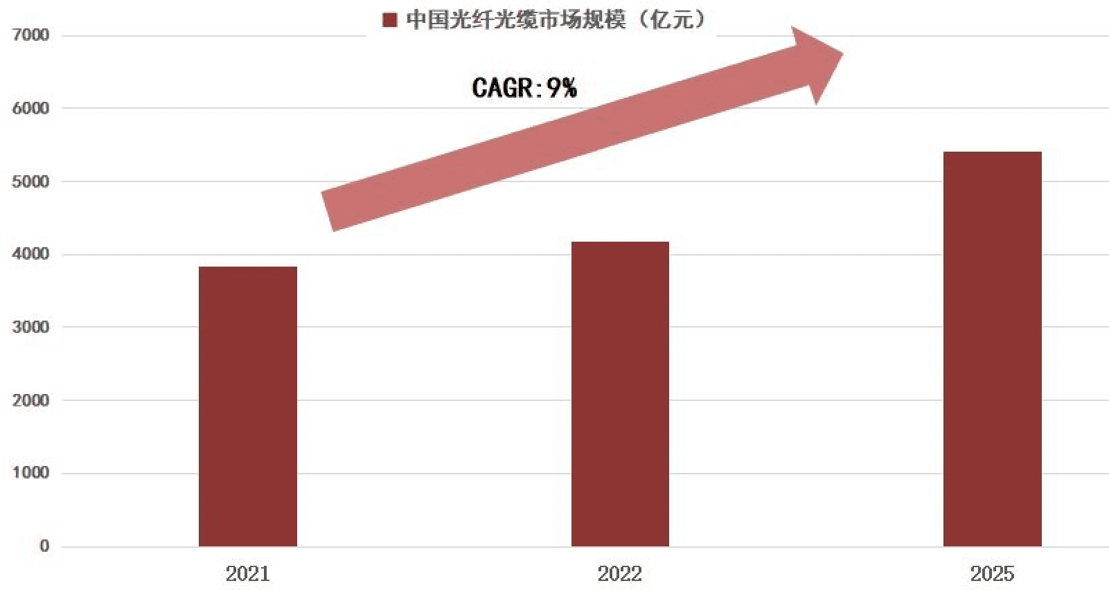 有机构预计,在双千兆网络建设持续推进以及数字经济与实体经济的融合持续深化的背景下,我国光纤光缆市场规模有望持续增长并在2025年达到5408亿元,2021年到2025年年复合增长率为9%。
