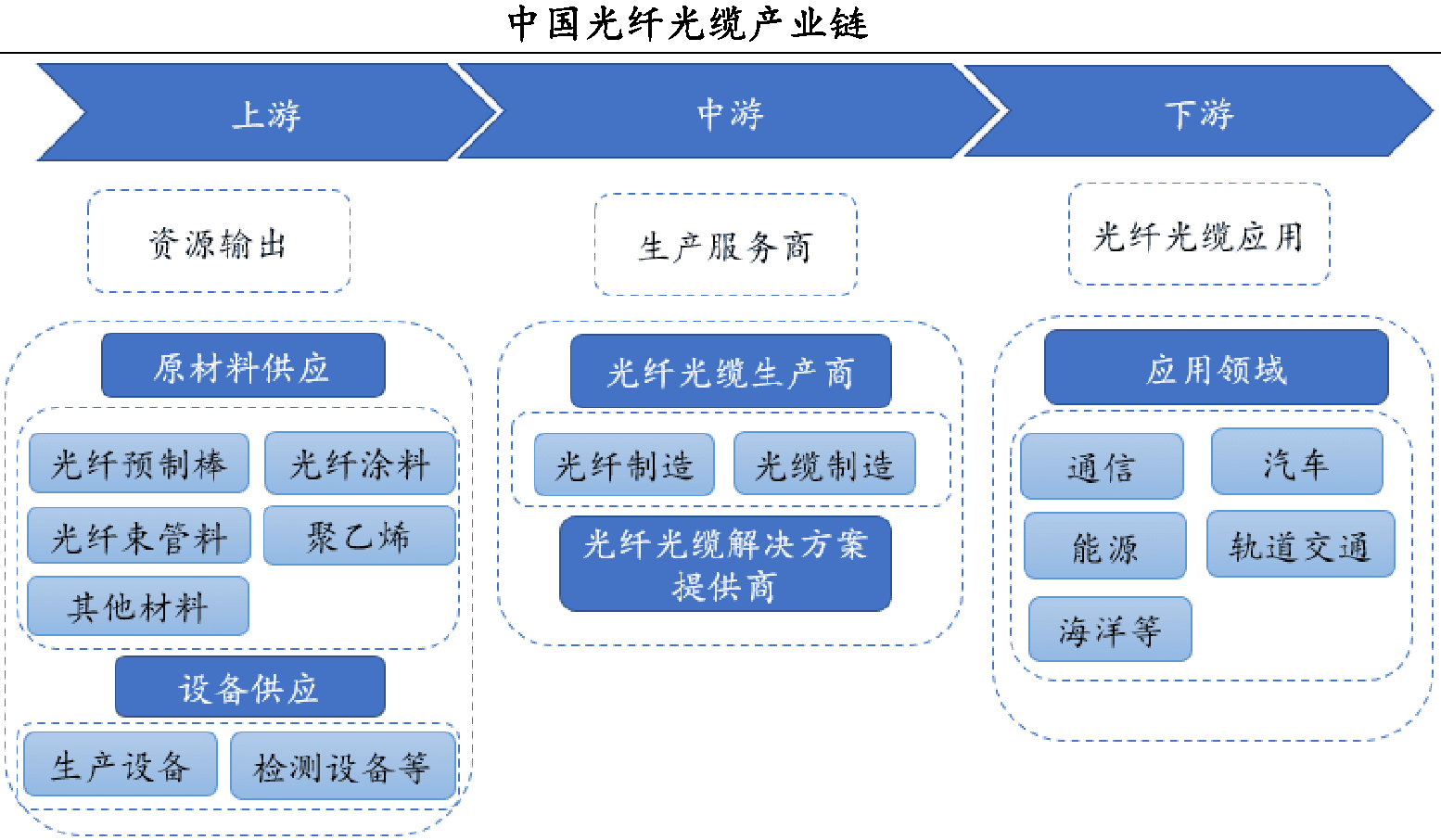从产业链来看,上游包括设备供应和各类原材料,原材料包括光纤涂料、光纤预制棒、聚乙烯等,其中光纤预制棒是光纤光缆产业链中附加值最高的一环,也是光纤工艺中最重要的部分;中游为光纤光缆生产商和光纤光缆解决方案提供商;下游可以应用于通信、能源、汽车、轨道交通等众多领域。