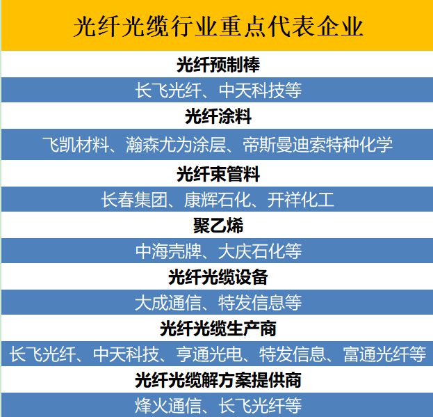 在光纤光缆价值链中,光纤预制棒、光纤、光缆利润分成为7:2:1,光纤预制棒利润占比最高。目前国内长飞光纤、烽火通信、亨通光电、中天科技等头部企业均实现“光纤预制棒-光纤-光缆”的全产业链布局生产模式。