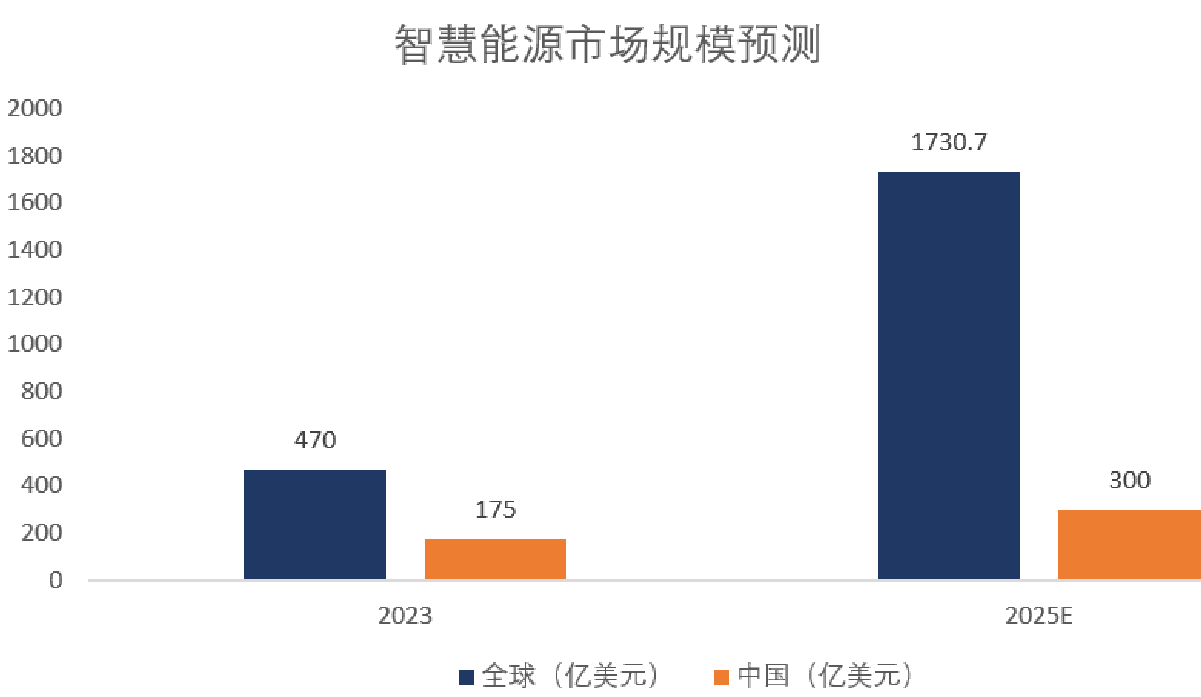 数据显示,2023年全球智慧能源市场规模为470亿美元。预测到2025年,全球智慧能源市场规模将进一步扩大,有望达到1730.7亿美元。2023年中国智慧能源市场规模为175亿美元,预计到2025年中国智慧能源市场规模将接近300亿美元。