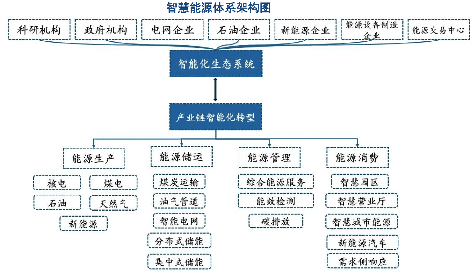 智慧能源体系架构包括能源和信息。能源主要是指涵盖能源产、供、销三大环节的电力系统基础设施。信息是指通过对能源产、供、销三大环节及相关环节的信息采集、传输、处理、存储和控制,实现信息化、智能化的生产和运营管理。