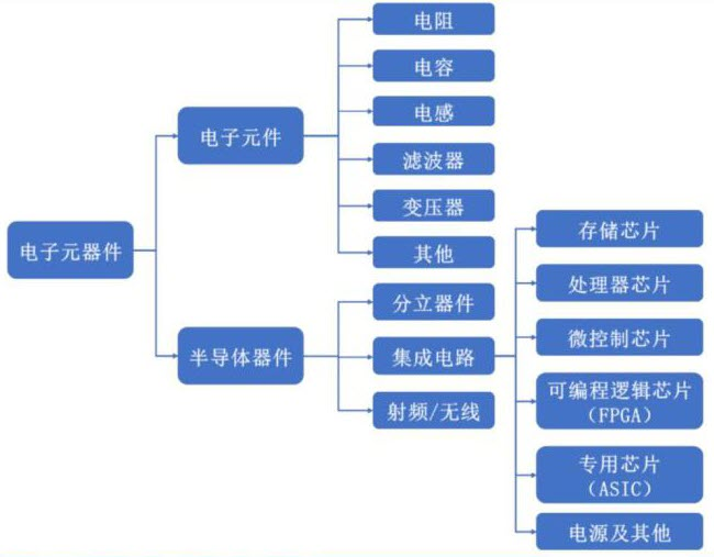 电子元器件可分为电子元件和电子器件(半导体),在生产加工时没有改变原材料分子成分的产品称为元件,在电路中无需加电源即可在有信号时工作,包括电阻、电容、电感等。器件是指在生产加工时改变了原材料分子结构的产品,包括分立器件、芯片等。