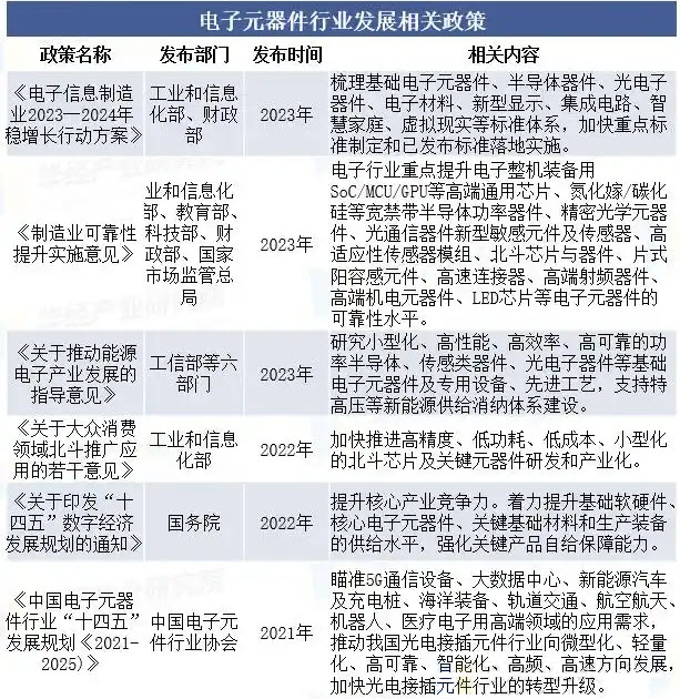 近年来国家有关部门陆续发布了一系列相关政策来促进电子元器件行业的发展。早在2021年发布的《中国电子元器件行业“十四五”发展规划《2021-2025)》就明确指出,瞄准5G通信设备、大数据中心、新能源汽车及充电桩、海洋装备、轨道交通、航空航天、机器人、医疗电子用高端领域的应用需求,推动我国光电接插元件行业向微型化、轻量化、高可靠、智能化、高频、高速方向发展,加快光电接插元件行业的转型升级。