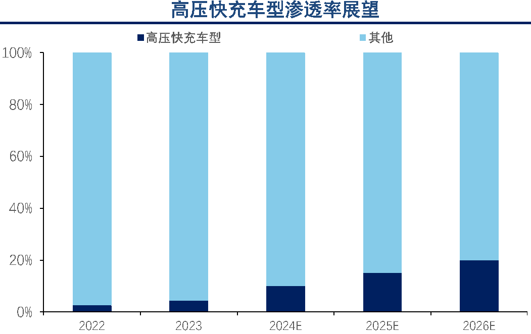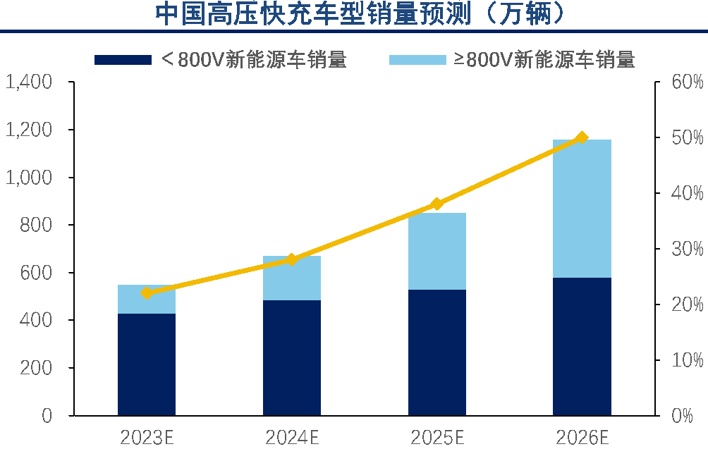 有机构表示,高压快充需求加速释放,2024年成为高压快充放量元年,预计到2026年800V及以上高压平台车型销量占国内新能源车比例将达50%,保有量将超1300万辆。
