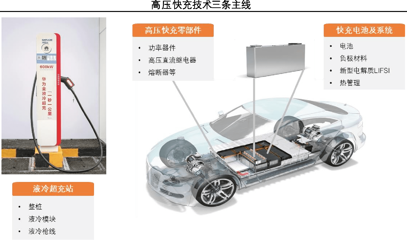 800V高压快充技术升级包括快充电池、车载高功率器件、800V高压充电桩三条主线。一是动力电池技术快充性能要求全面升级,包括动力电池制造,核心负极材料(硅基负极、包覆材料)、新型电解质LIFSI、导电剂(导电炭黑、CNT)改性等;二是高压快充零部件对功率器件、高压直流继电器、激励熔断器、高压连接器等的耐压要求大幅度提升,带动相关零部件产品升级;三是高压快充驱动充电模块向大功率、液冷超充趋势升级。